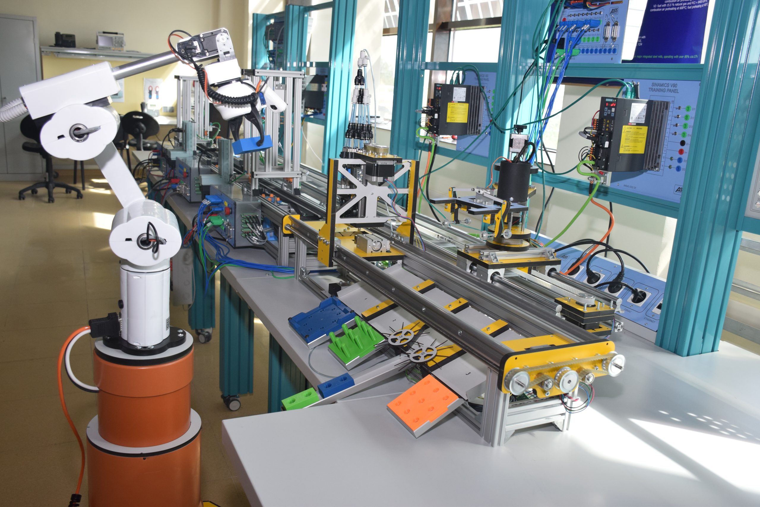 The Flexible Assembly Line has been designed to enable the application and testing of a broad range of manufacturing strategies such as pallet transport systems, warehouse stations, assembly stations and testing stations, all interconnected with various industrial communication networks (Profibus, IO-Link, Profinet etc.).