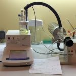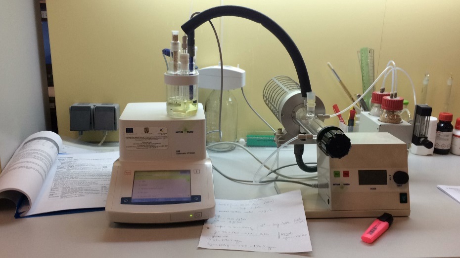 Electrochemical system for determination of water traces in various samples (range of water content in samples from 1 ppm to 5%). Compact equipment with coulometric cell without diaphragm, titration vessel, platinum electrode, automatic system for draining / solvent manager (ISO 10337 or equivalent compatible); sample weight (liquid or solid): 10 µg – 200 mg; color displayed (selectable measurement unit); method creation and saving, through existing software; resolution H2O: 0.1 µg. Samples from the domains: petroleum industry, cosmetics, pharmaceuticals, food industry, etc.