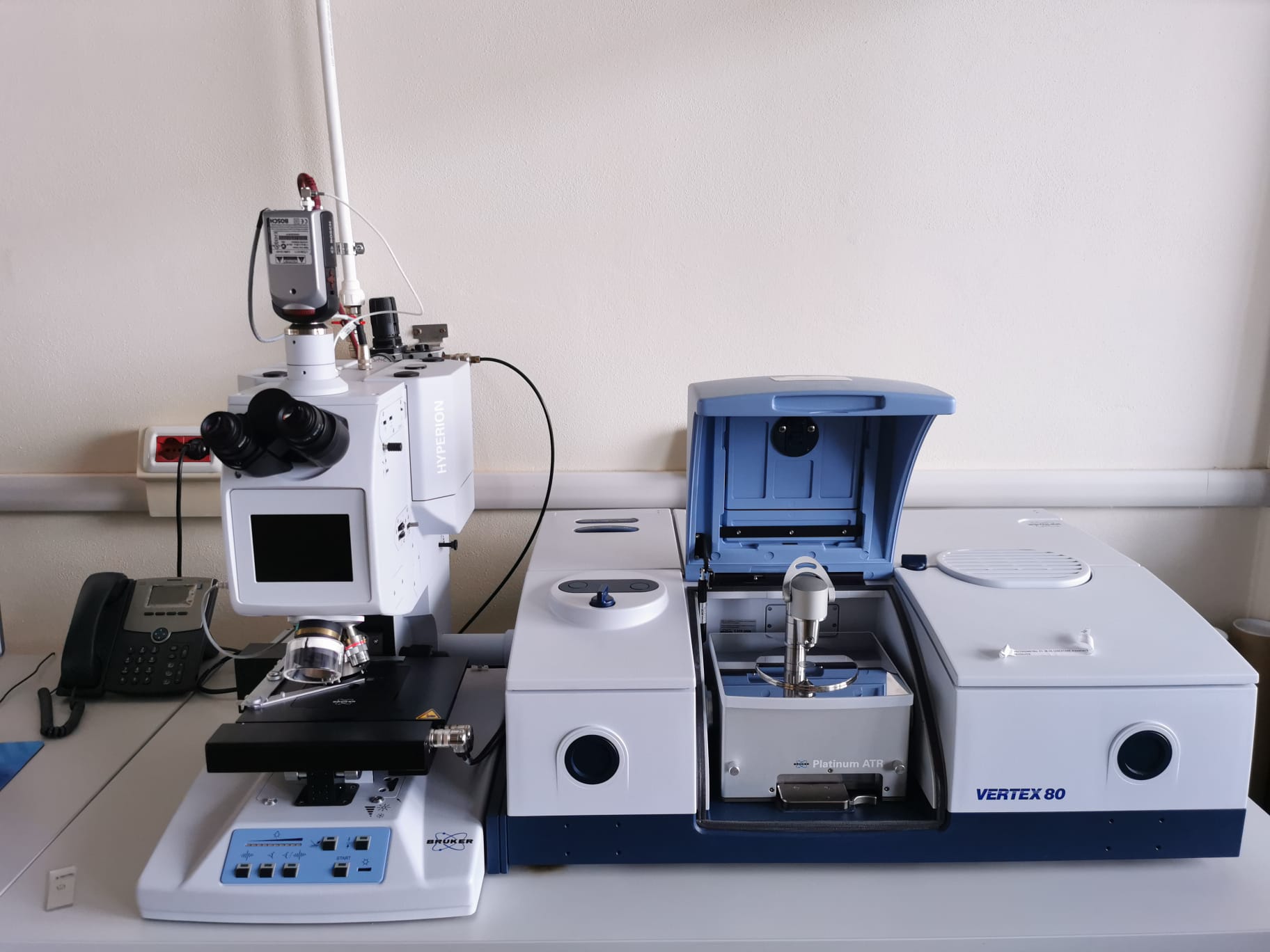 FT-IR spectroscopy system for advanced research consists of: FT-IR spectrometer Vertex 80 and high-resolution microscope Hyperion 3000. The system is designed for advanced research activities in various fields: physics of materials, environmental studies, studies of inorganic, organic, macromolecular and pharmacology, molecular and cellular biology, research in ceramics and semiconductor, composites and nanomaterials research, food analysis, study of documents and art objects and other fields.